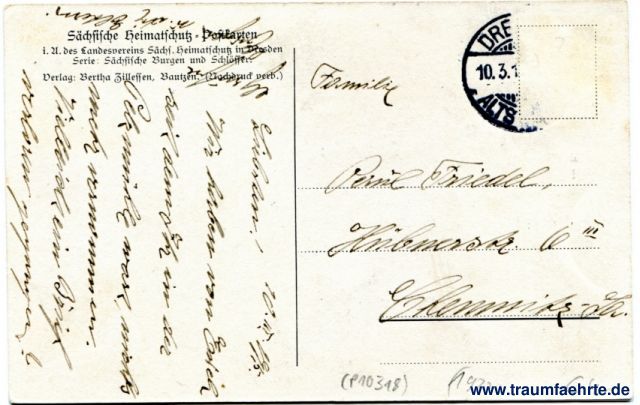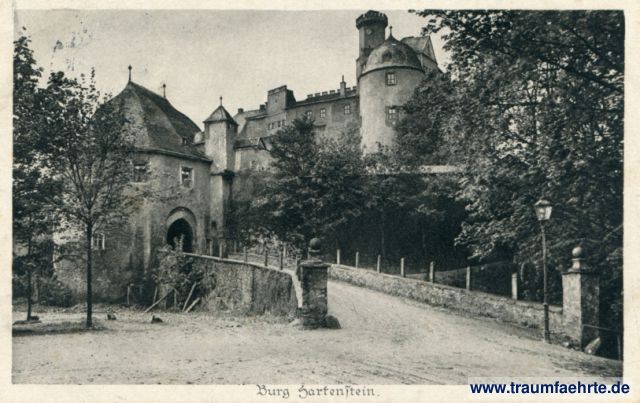– Details – Jahr: ca. 1920 Status: gelaufen, Briefmarke entfernt Beschriftung vorne: Burg Hartenstein. Beschriftung hinten: Sächsischer Heimatschutz – Postkarten, i. A. des Landesvereins Sächs. Heimatschutz in Dresden, Serie: Sächsische Burgen und Schlösser. Verlag: Bertha Zillessen, Bautzen. (Nachdruck verb.) Stempel: Dre(sden-)Alts(t.) (...) 10.3.(...) Hinweis: