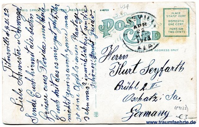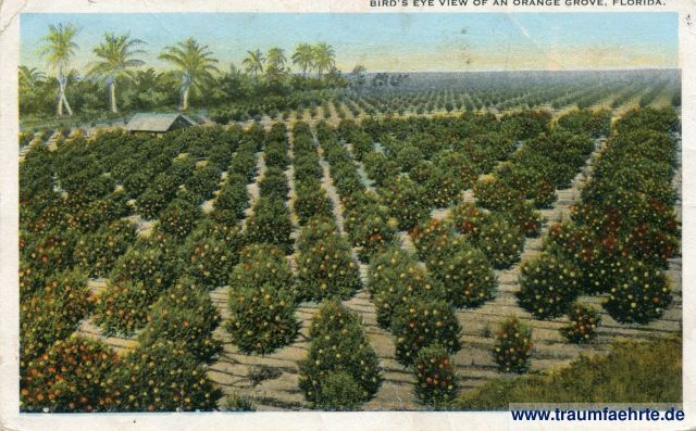 – Details – Year: ca. 1920 Postal state: postally used 1923, stamp removed Inscription front: Bird's eye view of an orange grove, Florida Inscription back: This space for printing messages. A-45723, Post Card, Place stamp here, Domestic one cent, Foreign two cents, This space for address only. C.T. American Art, CT Chicago Postmark(s): (...)sville, APR 22, 1923, (...) Please note: