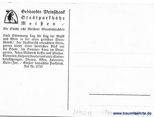 – Details – Jahr: ca. 1925 Status: ungelaufen Beschriftung vorne: Stadtparkhöhe Beschriftung hinten: Gebhardt's Weinschänk, Stadtparkhöhe Meißen, Die Stätte echt Meißner Weinfröhlichkeit, Diese Stimmung Tag für Tag bei Musik und Wein in der alten gotischen Weinschänke! Der künstlerisch erleuchtete Weingarten bietet einen herrlichen Blick auf die Stadt. Im Sommer Tanz im Weingarten. Jeden Mittwoch Kaffee und Plinsen. Eselreiten, Kasperletheater und viele Kinderbelustigungen. Pfauen, Affen, Fasanerie, Klein-Zoo. / Großer bewachter Parkplatz. Ruf Nr. 2725 Stempel: keine Hinweis: