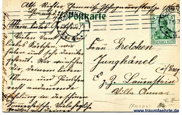 – Details – Year: 1907 Postal state: postally used 1910 Inscription front: Chemnitz, Waldschänke im Zeissigwalde Inscription back: Postkarte, Alleinverlag Edm. Papezik, Chemnitz 1907 Postmark(s): 2x Chemnitz, 4, 29.7.10.12-1N.; --- Please note: