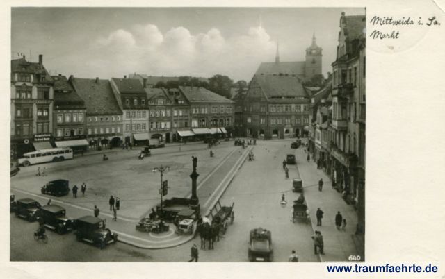 – Details – Jahr: ca. 1940 Status: ungelaufen Beschriftung vorne: Mittweida i. Sa. Markt, 640 Beschriftung hinten: Original Neubert-Foto, Verlag Erhard Neubert, Chemnitz, Museumstraße 2. Fernruf 4463, Freigegeben R. L. M. Nr. E. 05537 / 43 Stempel: keine Hinweis: