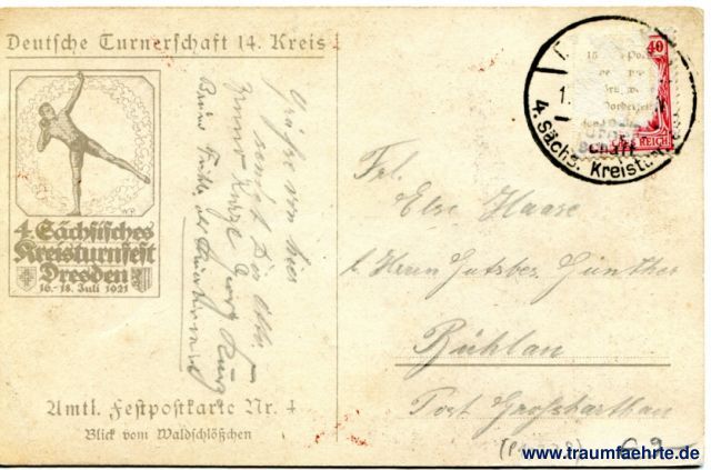 – Details – Jahr: 1921 Status: gelaufen, Briefmarke entfernt Beschriftung vorne: 4. Sächsisches Kreisturnfest, Dresden 1921. Nenke & Ostermaier, Dresden. Beschriftung hinten: Deutsche Turnerschaft 14. Kreis, 4. Sächsisches Kreisturnfest Dresden, 16.-18. Juli 1921, Amtl. Feldpostkarte Nr. 4 Blick vom Waldschlösschen Stempel: (Dresden, Deutsche Turner-Schaft), 4. Sächs. Kreisturnfest, 1.(...)N Hinweis: