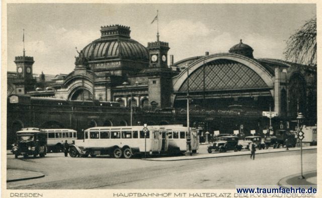 Inscription front: Dresden, Hauptbahnhof mit Halteplatz der K.V.G.-Autobusse