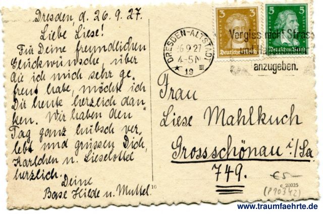 Stempel: Dresden-Altstadt, 19, III, 26 9 27; Vergiss nicht Strasse und Hausnummer anzugeben.