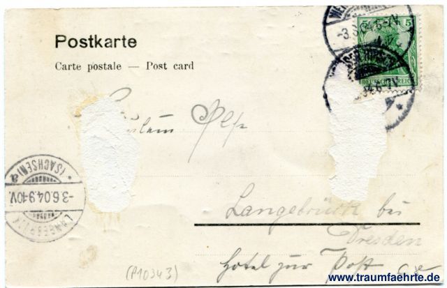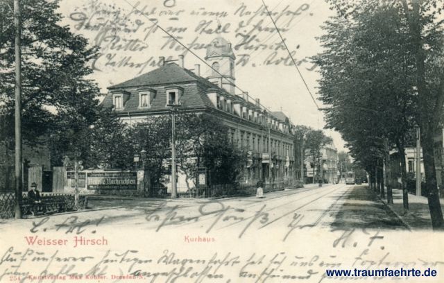 – Details – Jahr: ca. 1900 Status: gelaufen 1904 Beschriftung vorne: Weisser Hirsch, Kurhaus. 254 Kunstverlag Max Köhler. Dresden-N. Inseraten- u. Abonnement-Annahme Dresdner Neuste Nachrichten im Eckladen bei Herrn Custav Much, Buchdruckerei,... Beschriftung hinten: Postkarte, Carte postale – Post card Stempel: 2x Weisser Hirsch, (...), 3.3.04.6-7V; Langebrück (Sachsen), a, -3.6.04.9-10V. Hinweis: