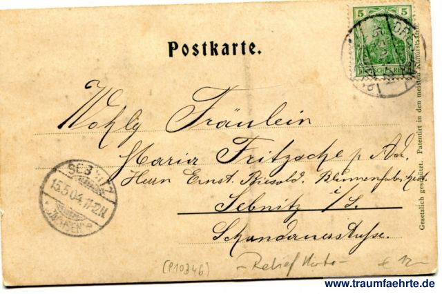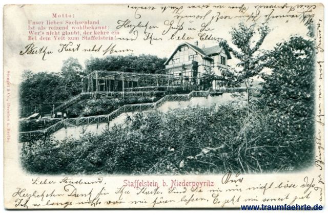 – Details – Jahr: ca. 1900 Status: gelaufen 1904 Beschriftung vorne: Staffelstein b. Niederpoyritz, Motto: Unser liebes Sachsenland / Ist als reizend wohlbekannt; / Wer's nicht glaubt, der kehre ein / Bei dem Veit zum Staffelstein! Stengel & Co., Dresden u. Berlin Beschriftung hinten: Postkarte. Gesetzlich geschützt. Patentirt in den meisten Kulturstaaten. Stempel: Dresden-(...), b, 15.5.04.1-2V; Sebnitz (Sachsen), e, 15.5.04.11-12N Hinweis: