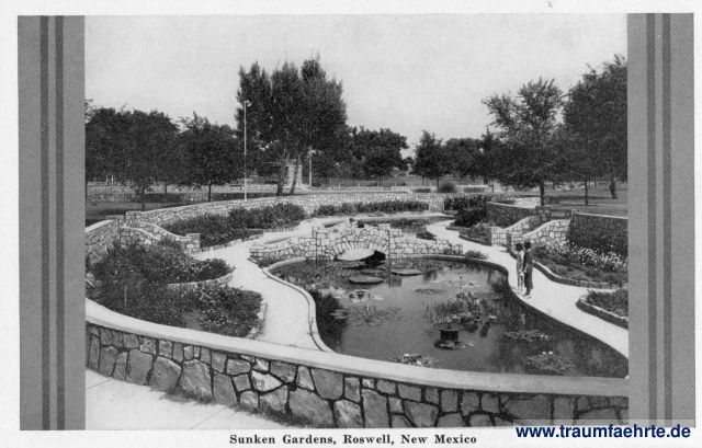 – Details – Year: ca. 1920 Postal state: postally unused Inscription front: Sunken Gardens, Roswell, New Mexico Inscription back: This side for message, Post Card, Place stamp here, R-193, A Natural-Finish Card Made by Graycraft Card Co., Danville, Va. Postmark(s): none Please note: