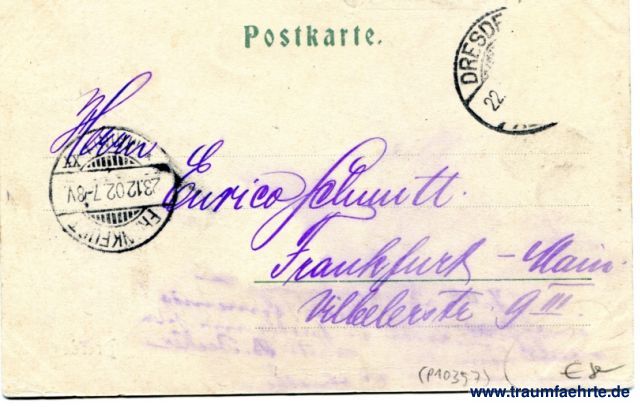 – Details – Jahr: ca. 1900 Status: gelaufen 1902 Beschriftung vorne: Dresden, Kaiserpalast, Stengel & Co., Dresden u. Berlin 3148 Beschriftung hinten: Postkarte. Stempel: Dresde(n ...), 22. (...); Frankfurt (Main), XX, 23.12.02.7-8V. Hinweis: