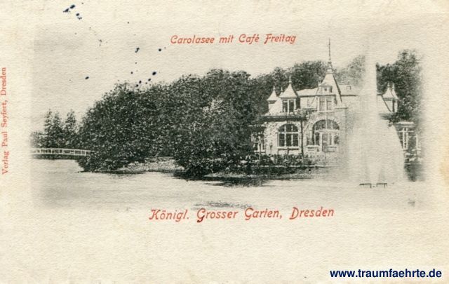 Beschriftung vorne: Königl. Grosser Garten, Dresden, Carolasee mit Café Freitag, Verlag Paul Seyfert, Dresden