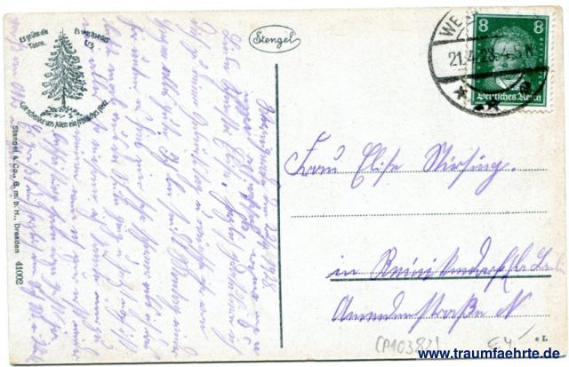 – Details – Jahr: ca. 1925 Status: gelaufen 1928 Beschriftung vorne: Wernigerode, Harz, Markt mit Rathaus Beschriftung hinten: Stengel, Es grüne die Tanne. Es wachse das Erz. Gott schenke uns Allen ein fröhliches Herz. Stengel & Co., G. m. b. H., Dresden, 41002, e L Stempel: We(rnigerode), (e), 21.4.28.4-5N Hinweis: