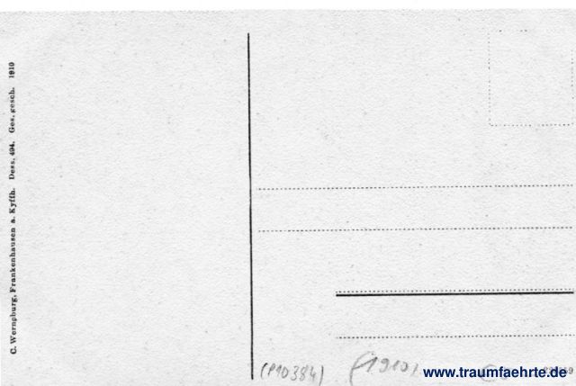 – Details – Jahr: 1910 Status: ungelaufen Beschriftung vorne: Kyffhäuser Denkmal, Reiterstandbild, Der alte Barbarossa, Wirtschaft Beschriftung hinten: C. Werneburg, Frankenhausen a. Kyffh. Dess. 494. Ges. gesch. 1910, 228559 Stempel: keine Hinweis: