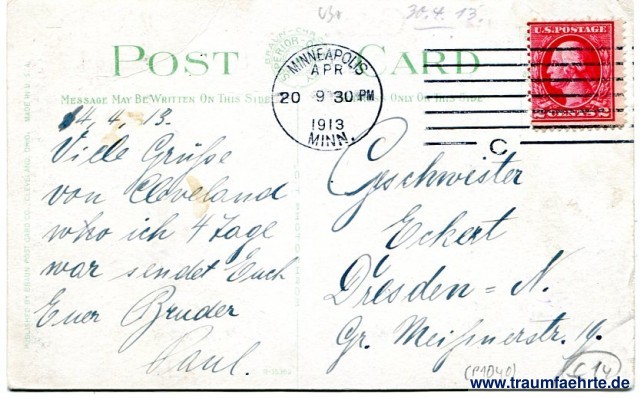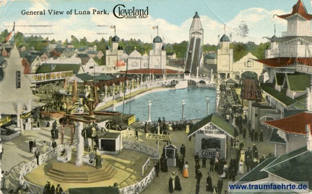 – Details – Jahr: ca. 1910 Status: gelaufen 1913 Beschriftung vorne: General View of Luna Park, Cleveland, Sixth City Beschriftung hinten: Braun-Chrom(e), Superior Quality, Post Card, Message May Be Written On This Side, Address Only On This Side, C.T. Photochrom, Published by Braun Post Card Co., Cleveland, Ohio. Made in U.S.A. R-35362 Stempel: Minneapolis, APR, 20 9 30pm, 1913, MINN. Hinweis: