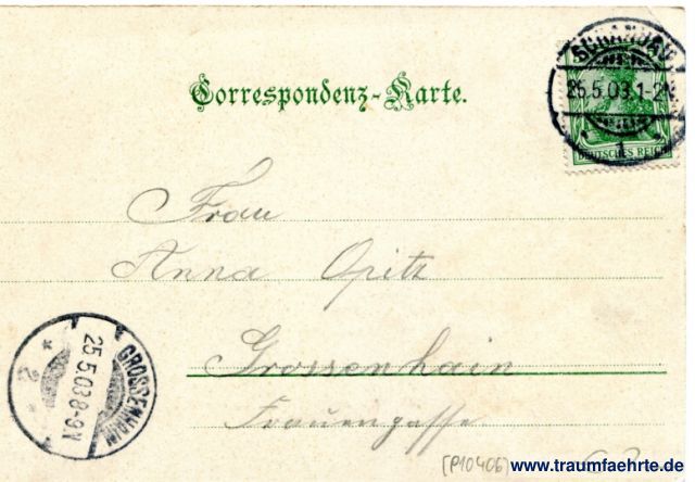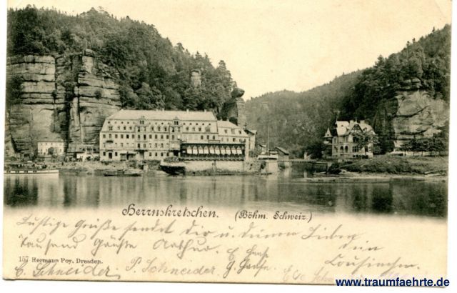 – Details – Jahr: ca. 1900 Status: gelaufen 1903 Beschriftung vorne: Herrenskretschen. (Böhm. Schweiz.), 157 Hermann Poy, Dresden. Beschriftung hinten: Correspondenz-Karte. Stempel: Schandau, 1, 25.5.03.1-2N; Grossenhain, a, 25.5.03.8-9N. Hinweis: