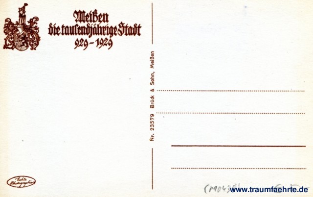 – Details – Year: 1926 Postal state: postally unused Inscription front: Blick auf Alt-Meißen Inscription back: Meißen, die tausendjährige Stadt, 929-1929, Echte Photographie, Nr. 23579 Brück & Sohn, Meißen Postmark(s): none Please note: