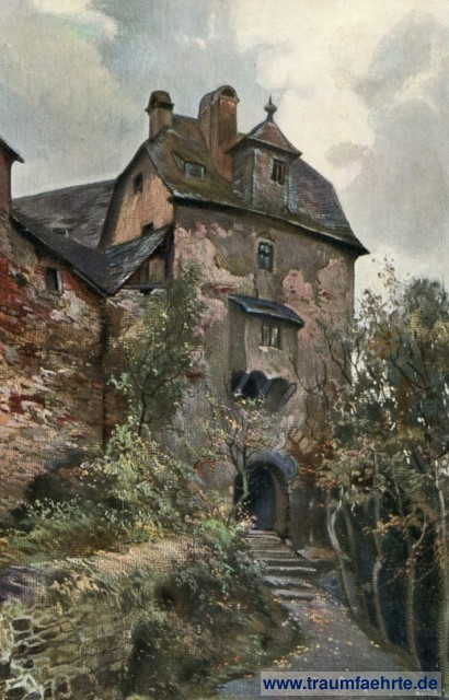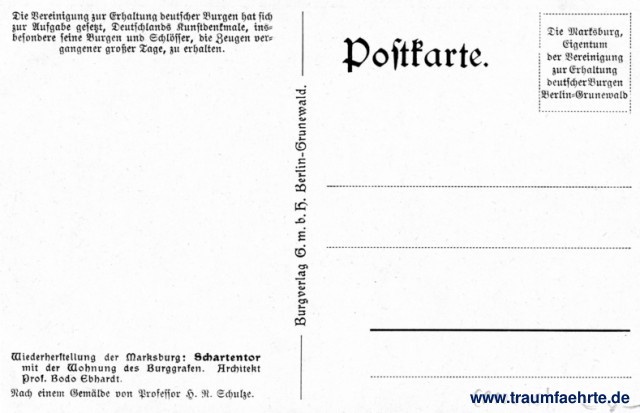 – Details – Jahr: ca. 1940 Status: ungelaufen Beschriftung vorne: Hans R. Schulze Beschriftung hinten: Postkarte. Burgverlag G.m.b.H. Berlin-Grunewald. Die Vereinigung zur Erhaltung deutscher Burgen hat sich zur Aufgabe gesetzt, Deutschlands Kunstdenkmale, insbesondere seine Burgen und Schlösser, die Zeugen vergangener großer Tage, zu erhalten. Wiederherstellung der Marksburg: Schartentor mit der Wohnung des Burggrafen. Architekt Prof. Bodo Ebhardt. Nach einem Gemälde von Professor H. R. Schulze. Die Marksburg, Eigentum der Vereinigung zur Erhaltung deutscher Burgen, Berlin-Grunewald Stempel: keine Hinweis: