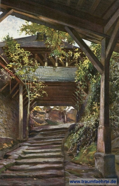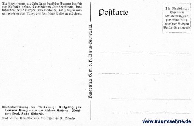 – Details – Jahr: ca. 1940 Status: ungelaufen Beschriftung vorne: Hans R. Schulze Beschriftung hinten: Postkarte. Burgverlag G.m.b.H. Berlin-Grunewald. Die Vereinigung zur Erhaltung deutscher Burgen hat sich zur Aufgabe gesetzt, Deutschlands Kunstdenkmale, insbesondere seine Burgen und Schlösser, die Zeugen vergangener großer Tage, zu erhalten. Wiederherstellung der Marksburg: Aufgang zur innern Burg unter der kleinen Batterie. Architekt Prof. Bodo Ebhardt. Nach einem Gemälde von Professor H. R. Schulze. Die Marksburg, Eigentum der Vereinigung zur Erhaltung deutscher Burgen, Berlin-Grunewald Stempel: keine Hinweis: