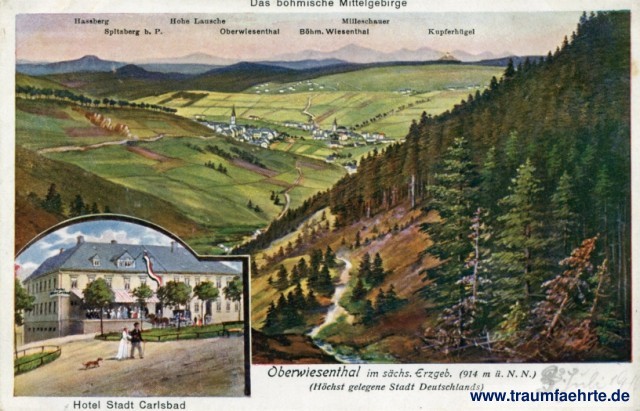 – Details – Year: ca. 1905 Postal state: postally unused Inscription front: Oberwiesenthal im sächs. Erzgeb. (914 m. ü. N. N.) (Höchst gelegene Stadt Deutschlands), Das böhmische Mittelgebirge, Hassberg, Spitzberg b. P. Hohe Lausche, Oberwiesenthal, Böhm. Wiesenthal, Kupferhügel, Hotel Stadt Carlsbad Inscription back: Postkarte, An ... in ... Postmark(s): none Please note: