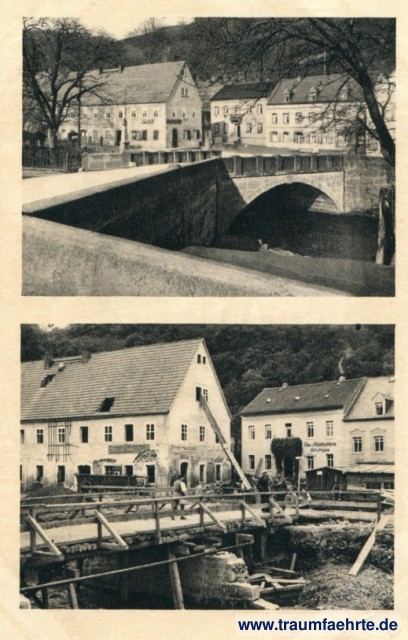 Schwarzweißfotografie mit zwei Ansichten – 1.) Brücke vor dem Unwetter (8./9. Juli 1927), 2.) Ersatzbrücke nach dem Unwetter