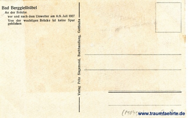 Beschriftung hinten: Bad Bergießhübel, An der Brücke, vor und nach dem Unwetter am 8./9. Juli 1927, Von der wuchtigen Brücke ist keine Spur geblieben, Verlag Fritz Siegemund, Buchhandlung, Gottleuba