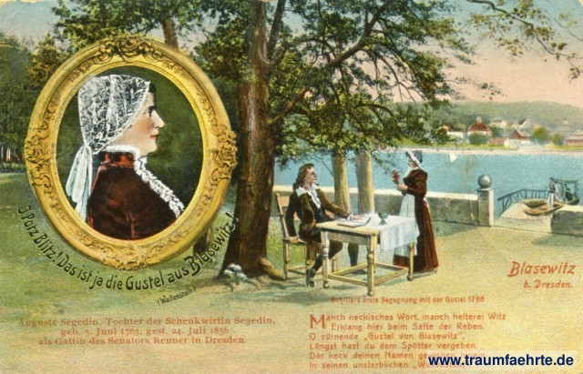 – Details – Jahr: 1913 Status: gelaufen 1913 Beschriftung vorne: Blasewitz b. Dresden. J Potz Blitz! Das ist ja die Gustel aus Blasewitz! (Wallenstein) Auguste Segedin, Tochter der Schenkwirtin Segedin, geb. 5. Juni 1763, gest. 24. Juli 1856 als Gattin des Senators Renner in Dresden. Schillers erste Begegnung mit der Gustel 1786, Manch neckisches Wort, manch heiterer Witz / Erklang hier beim Safte der Reben / O zürnende Gustel von Blasewitz, / Längst hast du dem Spötter vergeben. / Der keck deinen Namen gewoben hinein / In seinen unsterblichen Wallenstein, Beschriftung hinten: Verlag: Walter Karlowa, Dresden 1913. Ges. gesch. Stempel: Dr(esden-)Blasewitz, d, 24.5.13.(...)N Hinweis: