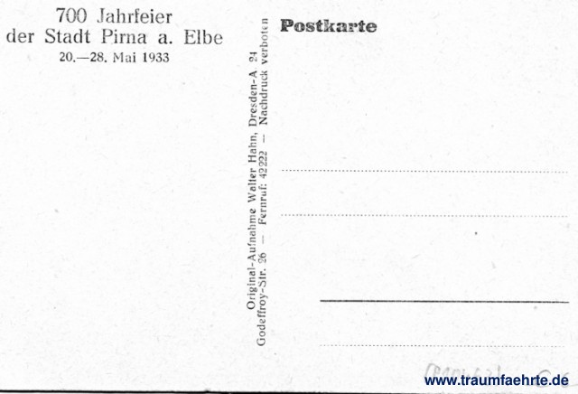 – Details – Year: 1933 Postal state: postally unused Inscription front: 700 Jahrfeier, Sächs. Schweiz, Pirna mit Elbebrücke und Copitz, W. Hahn (3838) Dresden Inscription back: Postkarte, 700 Jahrfeier der Stadt Pirna a. Elbe, 20.-28. Mai 1933, Original-Aufnahme Walter Hahn, Dresden-A. 24, Godeffroy-Str. 26 – Fernruf: 42 222 – Nachdruck verboten Postmark(s): none Please note: