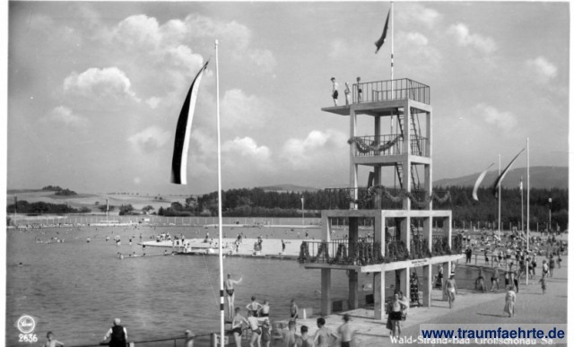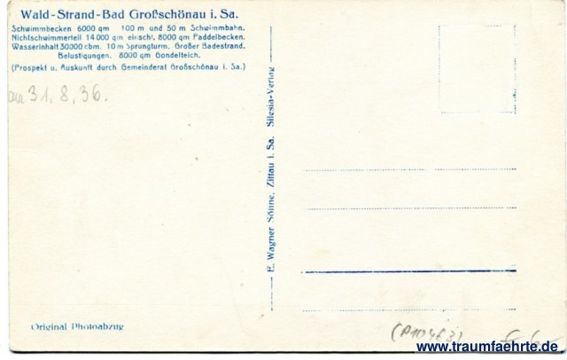 – Details – Jahr: ca. 1935 Status: ungelaufen Beschriftung vorne: kein Text Beschriftung hinten: Wald-Strand-Bad Großschönau Sa. Silesia, 2636 Stempel: Wald-Strand-Bad Großschönau i. Sa. Schwimmbecken 6000 qm, 100 m und 50 m Schwimmbahn. Nichtschwimmerteil 14 000 qm einschl. 8000 qm Paddelbecken. Wasserinhalt 30000 cbm. 10 m Sprungturm. Großer Badestrand. Belustigungen. 8000 qm Gondelteich. (Prospekt u. Auskunft durch Gemeinderat Großschönau i. Sa.) Original Photographie, E. Wagner Söhne, Zittau i. Sa. Silesia-Verlag Hinweis: