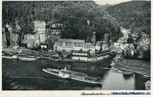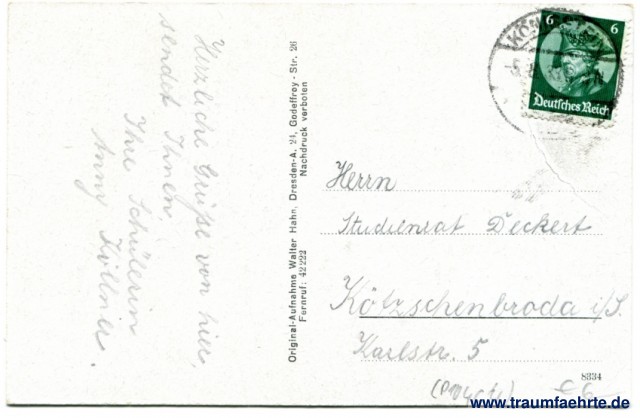 – Details – Jahr: ca. 1930 Status: gelaufen 1933 Beschriftung vorne: Herrenskretschen a./ Elbe, Sächs. Schweiz, W. Hahn Dresden, 4046 Beschriftung hinten: Original-Aufnahme Walter Hahn, Dresden-A. 24, Godeffroy-Str. 26, Fernruf: 42 222, Nachdruck verboten, 8334 Stempel: Königstein (...), -5. 8. 33.8-9N Hinweis: