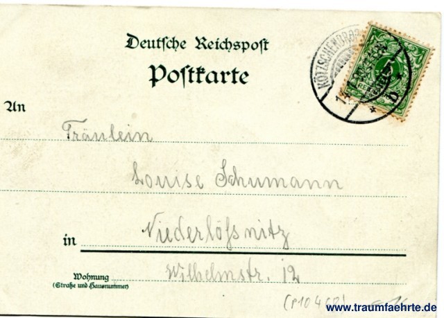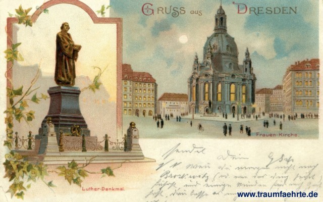 – Details – Jahr: ca. 1895 Status: gelaufen 1899 Beschriftung vorne: Gruss aus Dresden, Luther-Denkmal. Frauen-Kirche. Kunstanstalt J. Miesler, Berlin S. (155) Beschriftung hinten: Deutsche Reichspost, Postkarte, An ... in ... Wohnung (Straße und Hausnummer) Stempel: Kötzschenbroda, b, 14.1.99.11-12N Hinweis: