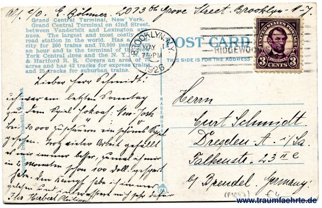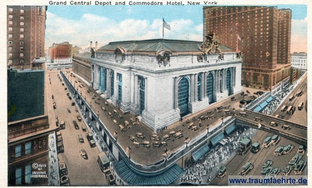 – Details – Jahr: 1919 Status: gelaufen 1926 Beschriftung vorne: Grand Central Depot and Commodore Hotel, New York, © 1919 by Irving Underhill, 9999 Beschriftung hinten: Post Card, This side is for the address, Grand Central Terminal, New York. Grand Central Terminal on 42nd Street, between Vanderbilt and Lexington ave nues. The largest and most costly railroad station in the world. Has a capacity for 200 trains and 70,000 passengers an hour and is the terminal of teh New York Central lines and the N. Y., N. H. & Hartford R. R. Covers an area of 70 acres and has 42 tracks for express trains and 25 tracks for suburban trains. Copyright Irving Underhill, new York. Made in USA, M Stempel: Brooklyn, N.Y. MAY (...), 7 30pm, 1926; --- Hinweis: