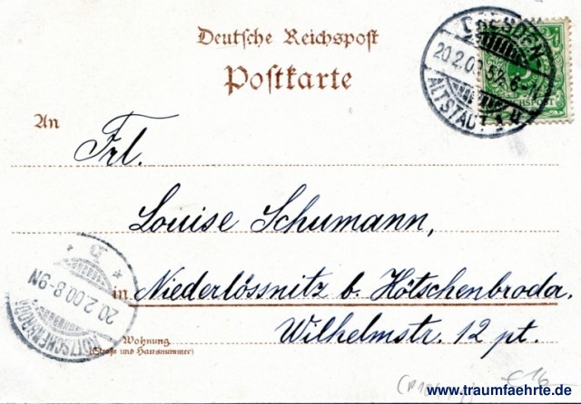 – Details – Jahr: ca. 1895 Status: gelaufen 1900 Beschriftung vorne: Gruss aus Dresden. Hof-kirche u. Schlossturm. Dresdner Kunstanstalt vorm. Moritz Zobel act.ges. Dresden. Beschriftung hinten: Deutsche Reichspost, Postkarte, An ... in ... Wohnung (Straße und Hausnummer) Stempel: Dresden-Altstadt 1, (u), 20.2.00.5½ 6 – N; Kötzschenbroda, b, 20. 2. 00.8-9N Hinweis: