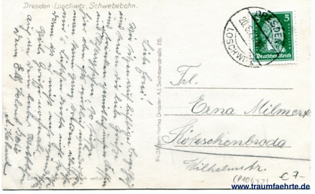 – Details – Jahr: ca. 1925 Status: gelaufen 1927 Beschriftung vorne: Dresden-Loschwitz . Schwebebahn. 33. Beschriftung hinten: Dresden-Loschwitz, Schwebebahn. Echte Photographie. Nachdruck verboten. No. 33 Stein-Verlag Dresden-A. 1. Seidnitzerstraße 26. Stempel: Dresden-Loschwitz, 20.6.27.10-11 Hinweis: