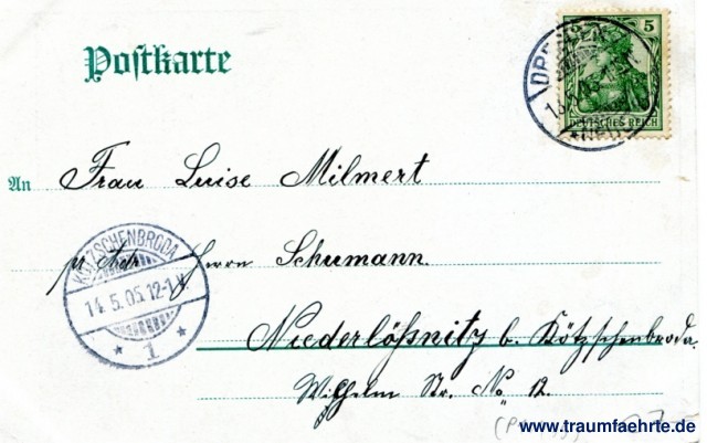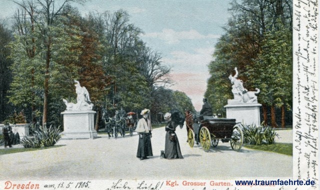 – Details – Jahr: ca. 1900 Status: gelaufen 1905 Beschriftung vorne: Dresden, Kgl. Grosser Garten, Haupt-Allee, F K D Typochrom, Kunstanstalt Felix Krille, Dresden-Strehlen. 331 Beschriftung hinten: Postkarte, An ... Stempel: Dresden-Neust(...), 13.5.05.11-12N.; Kötzschenbroda, 1, 14.5.05.12-1V. Hinweis: