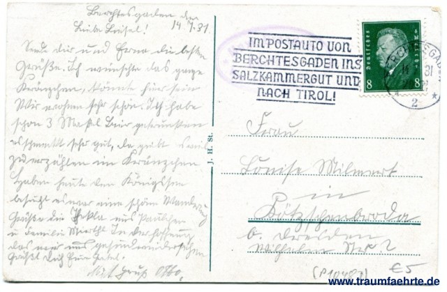 – Details – Jahr: ca. 1930 Status: gelaufen 1931 Beschriftung vorne: Berchtesgaden mit Watzmann. Beschriftung hinten: J. H. St. Stempel: (...); Im Postauto von Berchtesgaden ins Salzkammergut und nach Tirol!; Berchtesgaden, 14 7 31, 20 21, 2 Hinweis: