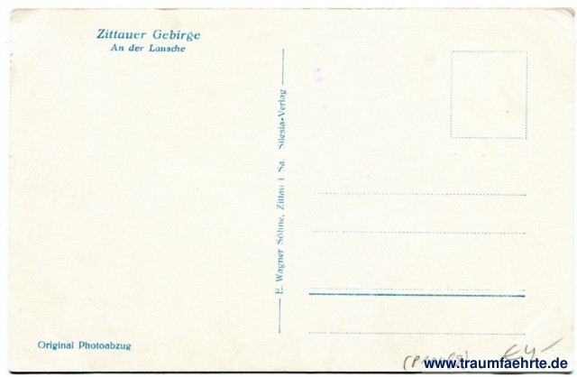 – Details – Jahr: ca. 1940 Status: ungelaufen Beschriftung vorne: Die Lausche 792 m u. d. M. Silesia, 4685 Beschriftung hinten: Zittauer Gebirge, An der Lausche, Original Photoabzug, E. Wagner Söhne, Zittau i. Sa. Silesia-Verlag Stempel: keine Hinweis: