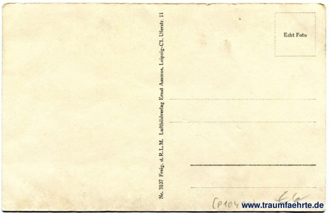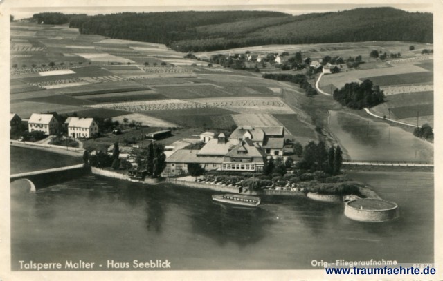 – Details – Jahr: ca. 1940 Status: ungelaufen Beschriftung vorne: Talsperre Malter – Haus Seeblick, Orig.-Fliegeraufnahme, 89820 Beschriftung hinten: Nr. 3107 Freig. D. R.L. Luftbildverlag Ernst Assmus, Leipzig-C1. Uferstr. 11 Ech Foto Stempel: keine Hinweis: