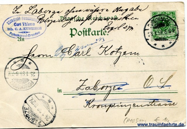 – Details – Jahr: ca. 1895 Status: gelaufen 1898 Beschriftung vorne: Dresden. Albertplatz mit Neustädter Hoftheater. 34. Hermann Poy, Dresden. Beschriftung hinten: Deutsche Reichspost, Postkarte. An ... in ... Stempel: 2x Potschappel, 23.1.98. 5-6N; Zaborze, 24.1.98 11-12V.; Sächsische Porzellanfabrik Carl Thieme, Inh. C. AS. Kuntzsch, Potschappel-Dresden Hinweis: