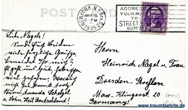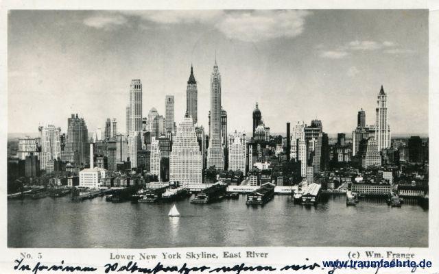 – Details – Jahr: ca. 1930 Status: gelaufen 1935 Beschriftung vorne: No. 5, Lower New York Skyline, East River, (c) Wm. Frange Beschriftung hinten: Post Card, Correespondence, Address Stempel: New York N. Y. Sta. G2, MAY 16, 2 – pm, 1935; Address your mail to street numb(er) Hinweis: