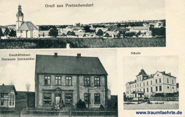 Beschriftung vorne: Gruß aus Pretzschendorf, Geschäftshaus Hermann Juncknickel, Schule