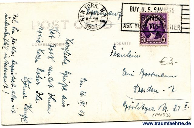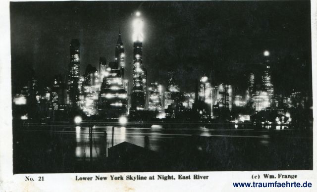 – Details – Jahr: ca. 1930 Status: gelaufen 1937 Beschriftung vorne: No. 21, Lower New York Skyline at Night, East River, (c) Wm. Frange Beschriftung hinten: Post Card, Correespondence, Address Stempel: New York N. Y. 5, APR 26, 9 – pm, 1937; Buy U.S. Savings, Bonds, Ask your postmaster Hinweis: