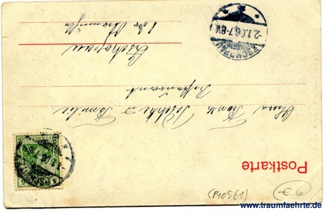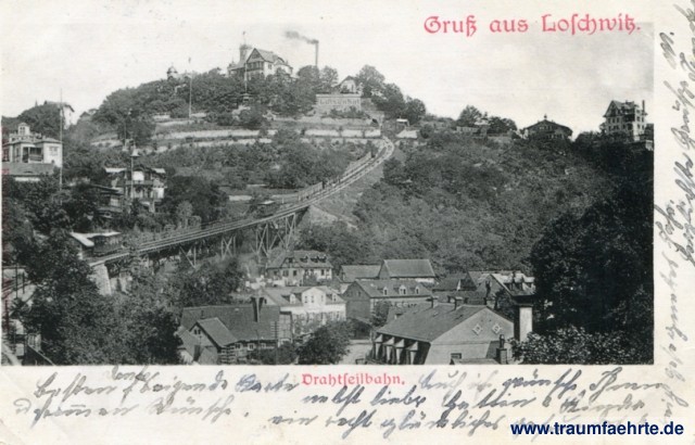 – Details – Year: ca. 1905 Postal state: postally used 1906 Inscription front: Gruß aus Loschwitz, Drahtseilbahn. C (3120 Kunstanstalt Lautz, Darmstadt Inscription back: Postkarte ... Postmark(s): Loschwitz, 1.1.06.7-8N; Zschopau, 2.1.06.7-8V Please note: