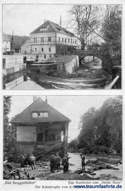 Schwarzweißfotografie mit zwei Ansichten – 1.) Sächsisches Haus vor der Flutkatastrophe vom 8./9. Juli 1927, 2.) zerstörtes Sächsisches Haus danach