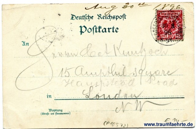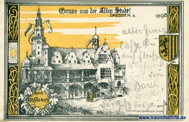– Details – Jahr: 1896 Status: gelaufen 1896 Beschriftung vorne: Gruss aus der Alten Stadt! Dresden, a. ... 1896, Das Rathaus, Peitz & Toepfer, Kunstanstalt, Dresden. Beschriftung hinten: Deutsche Reichspost, Postkarte, An ... in ... Wohnung (Straße und Hausnummer) ... Stempel: Dresden-Ausstellung, 30 8 96, 8-9V Hinweis: