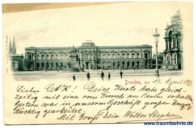– Details – Jahr: ca. 1895 Status: gelaufen 1897 Beschriftung vorne: Dresden, den..., Gemäldegallerie. Stengel & Co., Dresden, 3030 Beschriftung hinten: Postkarte, An ... in ... Wohnung (Straße und Hausnummer) ... Stempel: Dresden-Neust. 6, g, 15.4.97.7-8N Hinweis: