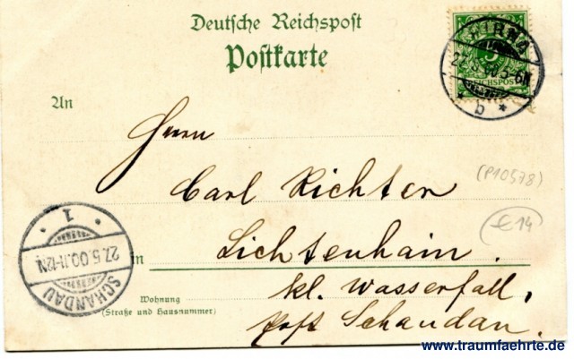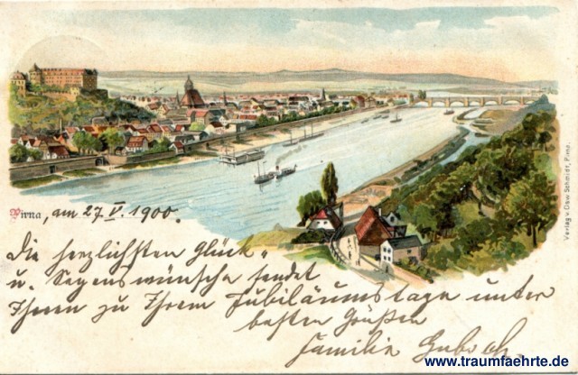 – Details – Year: ca. 1895 Postal state: postally used 1900 Inscription front: Pirna ..., Verlag v. Osw. Schmidt, Pirna. Inscription back: Deutsche Reichspost, Postkarte, An ... in ... Wohnung (Straße und Hausnummer) Postmark(s): Pirna, b, 27.5.00.5-6N; Schandau, 1, 27.5.00.11-12N. Please note: