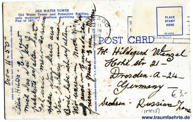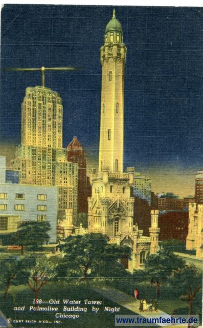– Details – Jahr: 1950 Status: gelaufen 1950, Briefmarke entfernt Beschriftung vorne: 198 – Old Water Tower and Palmolive Building by Night, Chicago, © Curt Teich & Co. Inc. Beschriftung hinten: Post Card, Place stamp here, OC-H354, Old Water Tower, Old Water Tower and Palmolive Building, only municipal structure surviving Chicago Fire of 1871. Aero Dist. Co., 201 East Grand Avenue, Chicago, Illinois, Genuine Curteich-Chicago C.T. Art-Colortone post card (Reg. U.S. Pat. off.) Stempel: 30 Chicago Ill. OCT 11, 7 pm, 1950; (...) Payroll Savings Hinweis: