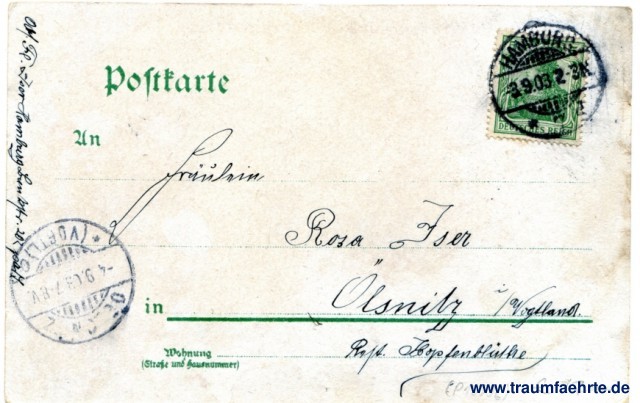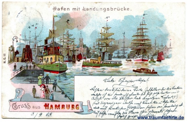 – Details – Jahr: ca. 1900 Status: gelaufen 1903 Beschriftung vorne: Gruss aus Hamburg, Hafen mit Landungsbrücke. Beschriftung hinten: Postkarte, An ... in ... Wohnung (Straße und Hausnummer) ... Stempel: Hamburg, 7, (d), -3.9.03.2-3N; Oelsnitz (Vogtl), 0, -4.9.03.7-8V. Hinweis: