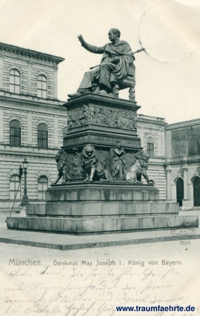 – Details – Jahr: ca. 1900 Status: gelaufen 1904 Beschriftung vorne: München. Denkmal Max Joseph I. König von Bayern.Wilhelm Hoffmann, A.-G, Dresden, 2618 Beschriftung hinten: Postkarte Stempel: Muenchen (...); Nuernberg (...) 4 Oct 9-10 Nm. 04 Hinweis: