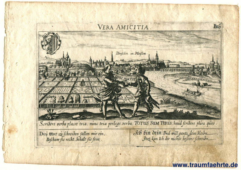 – Details – Jahr: 1625 Beschriftung: Vera Amicitia. B16. Dressden in Meißen. Scribere verba placet tria : nunc tria perlege verba : TOTUS SUM TUUS : haud scribere plura queo ; Drey Wort zu schreiben fallen mir ein, / Beschaw sie recht, behalt sie fein. // Ich bin dein: Und will ganz dein bleiben / Jtzt kan Ich dir nichts bessers schreibn. Hinweis: