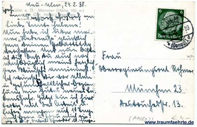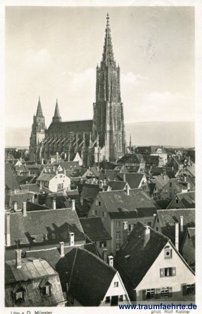 – Details – Year: ca. 1935 Postal state: postally used 1938 Inscription front: Ulm a. D. Münster. Phot. Rold Kellner Inscription back: Ulm a. D. Münster (Höhe 162 m), vom Chr. Hospiz gesehen, Aufnahme von Rolf Kellner, Karlsruhe i. B. Nr. 5742 J. Velten Verlag, Karlsruhe i. B. Postmark(s): Ulm (Donau), 1, d, 25.2.38.9-10 Please note: