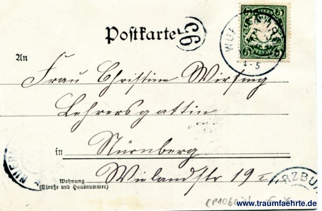 – Details – Year: 1899 Postal state: postally used 1900 Inscription front: Würzburg, Festung mit Mainviertel. 688 Hermann Martin, Kunstverlag, Nürnberg 1899 Inscription back: Postkarte, An ... in ... Wohnung (Straße und Hausnummer) ... Postmark(s): 1½x Wuerzburg, (...), 4-5; Nuernberg, 13 Sep 00, * 9-10N. * Please note: